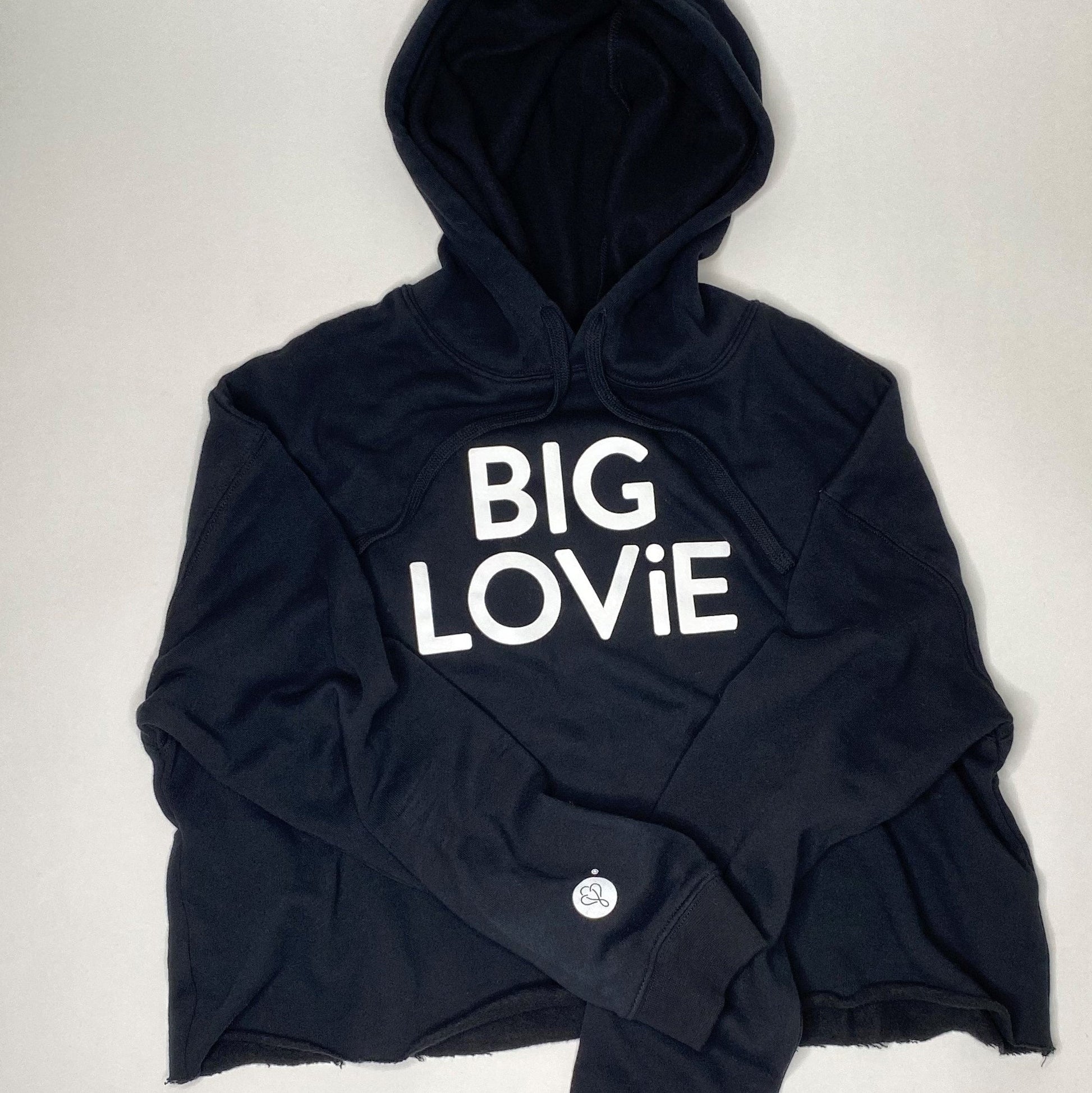 Get cozy in this soft fleece hooded sweatshirt - cropped at the waistline with matching flat drawcords and ribbed cuffs. A bold white BIG LOViE is imprinted across the front with our Infinite Love logo on the right sleeve.